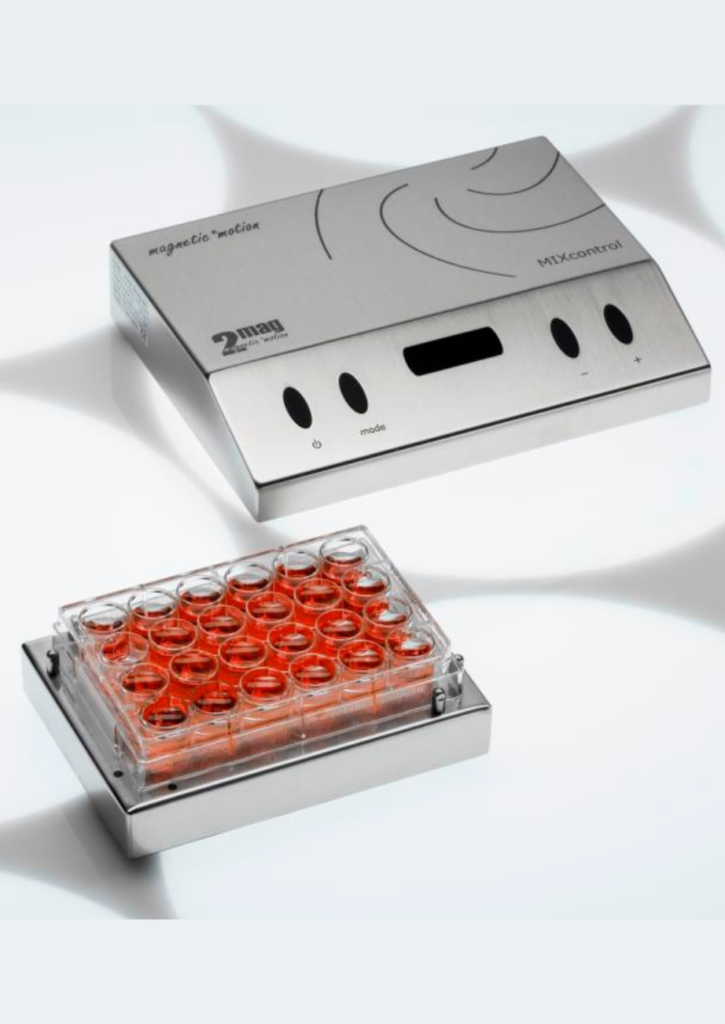 Ultra flat, wear-free 2mag magnetic stirrer with 24 stirring positions, suitable for 24 well microtiter plates.