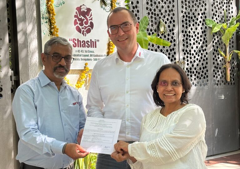 SRICO Directors Mr. Narasimha Murthy Bhatta and Mrs. Shalini Rao, together with Mr. Mark Bitterwolf, JULABO CMO and Director of Sales, during the official signing ceremony of the closer partnership at the SRICO headquarters in Bangalore.